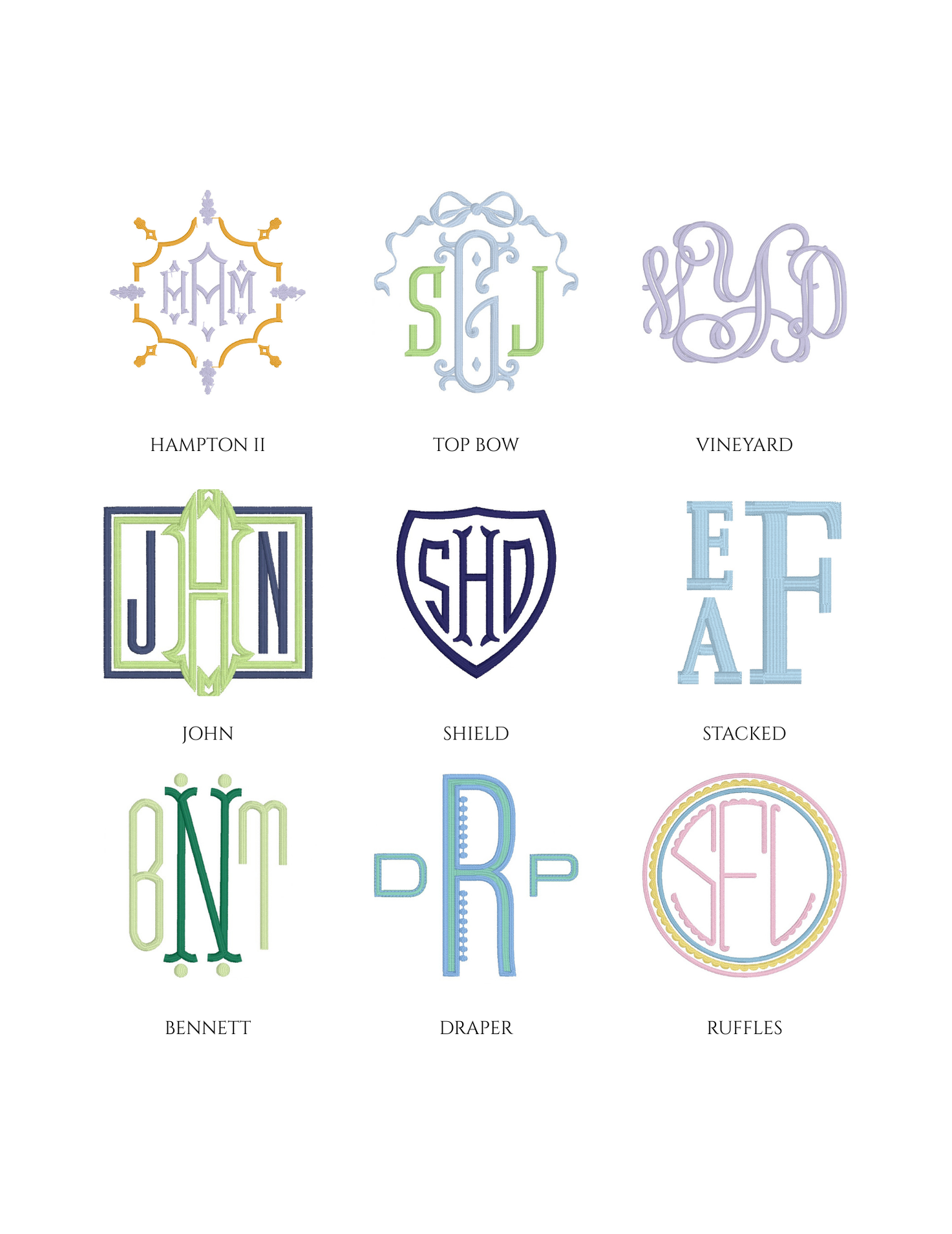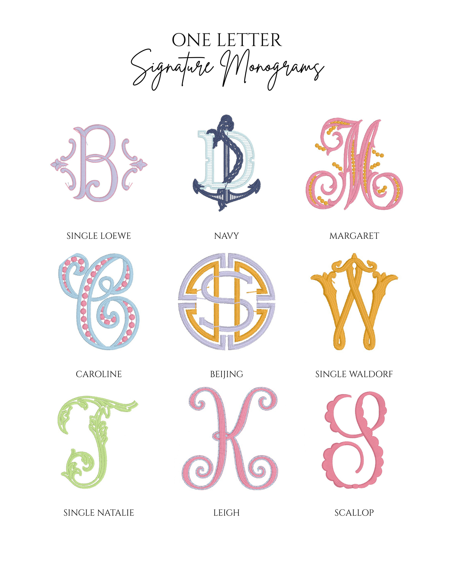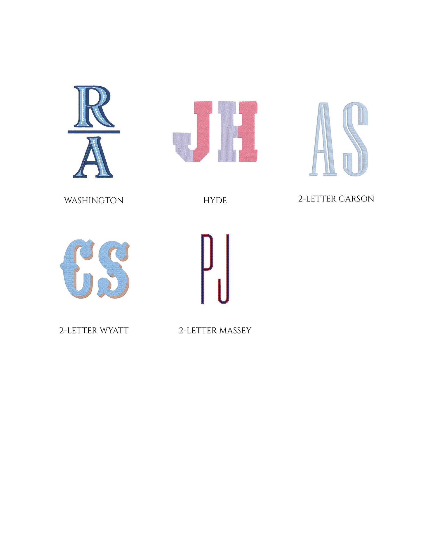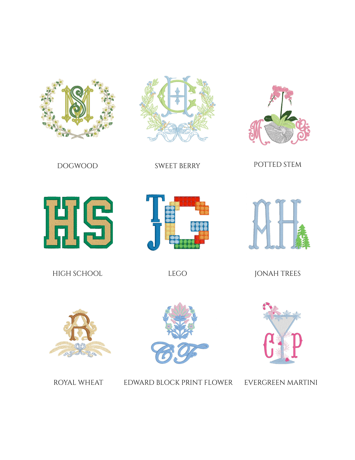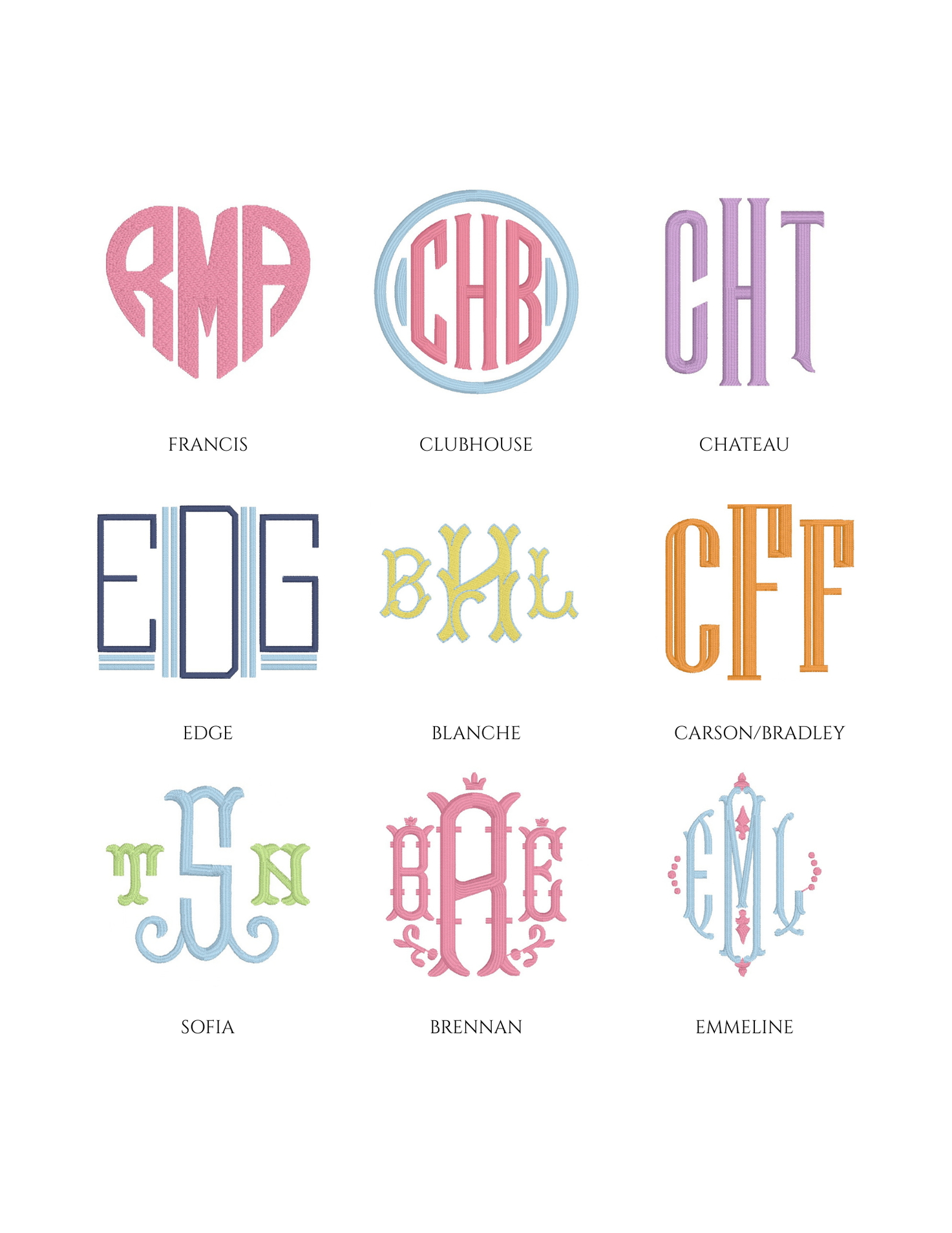 Embroidery is an art, and not every font or design style will fit or stitch well on every item. Below is a sample of some of the monograms in our collection.