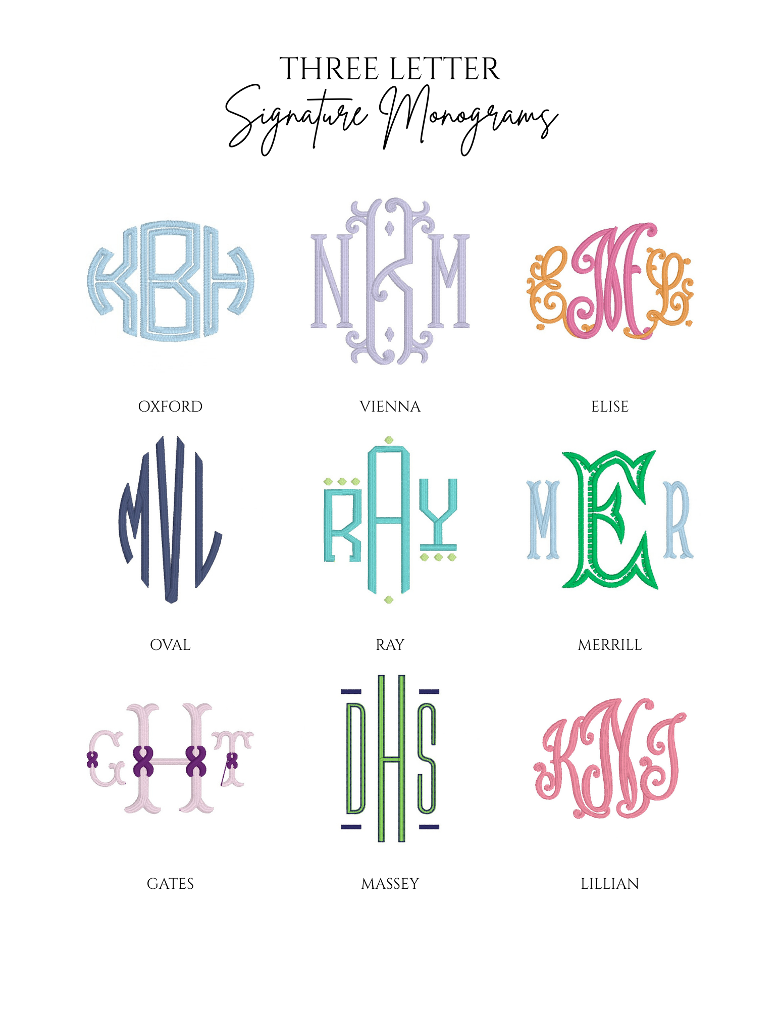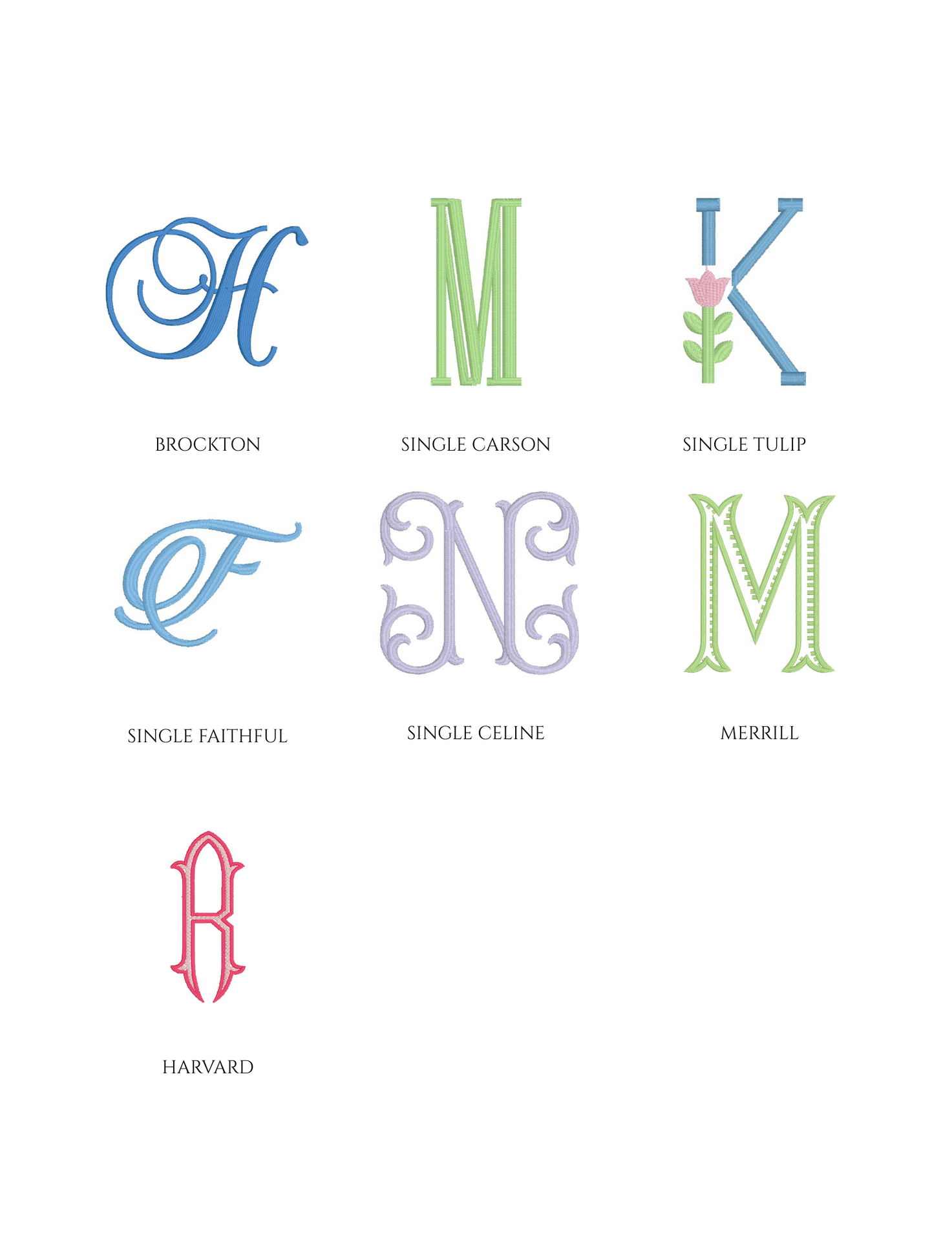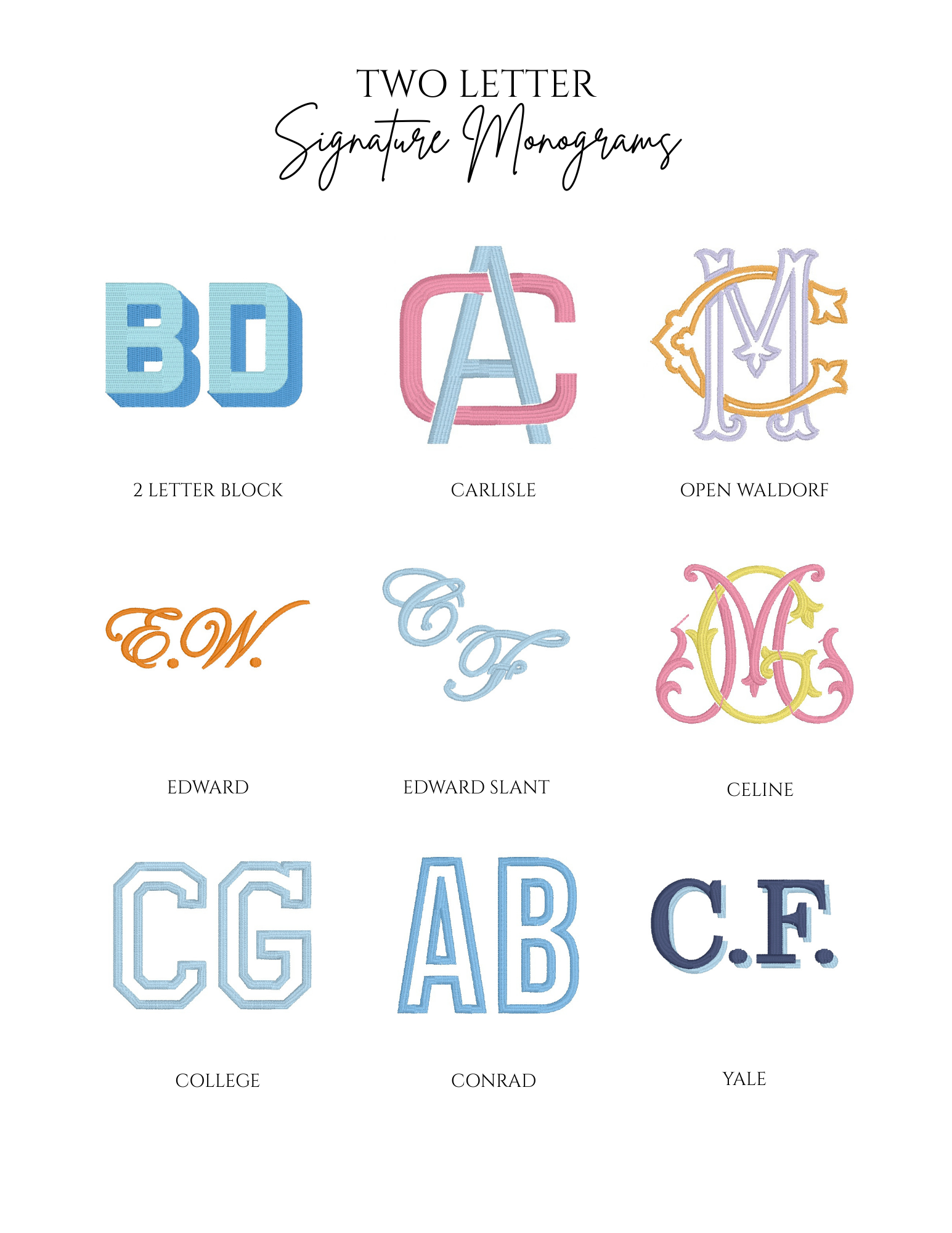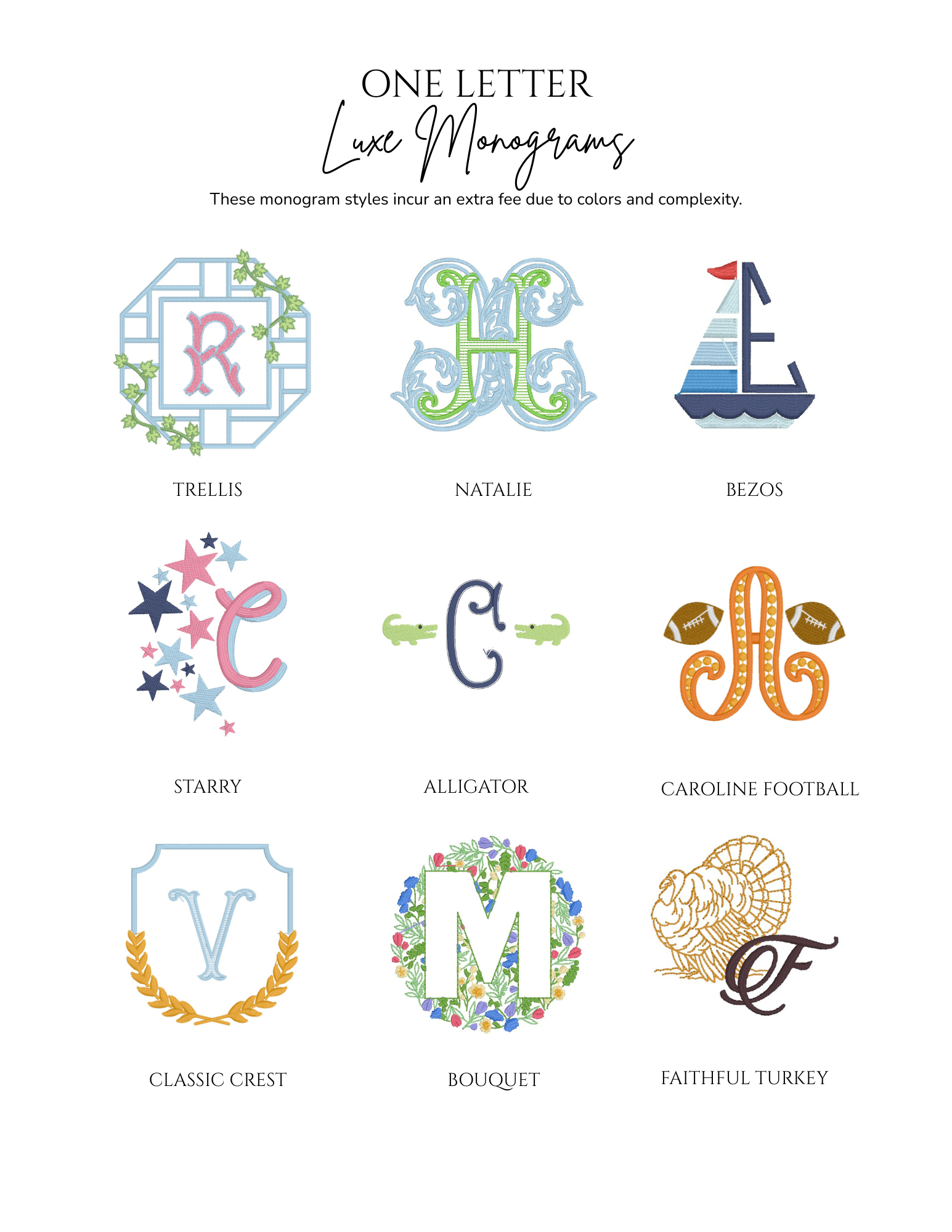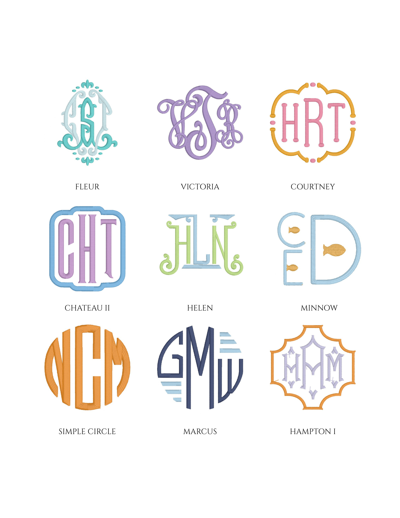 Embroidery is an art, and not every font or design style will fit or stitch well on every item. Below is a sample of some of the monograms in our collection.