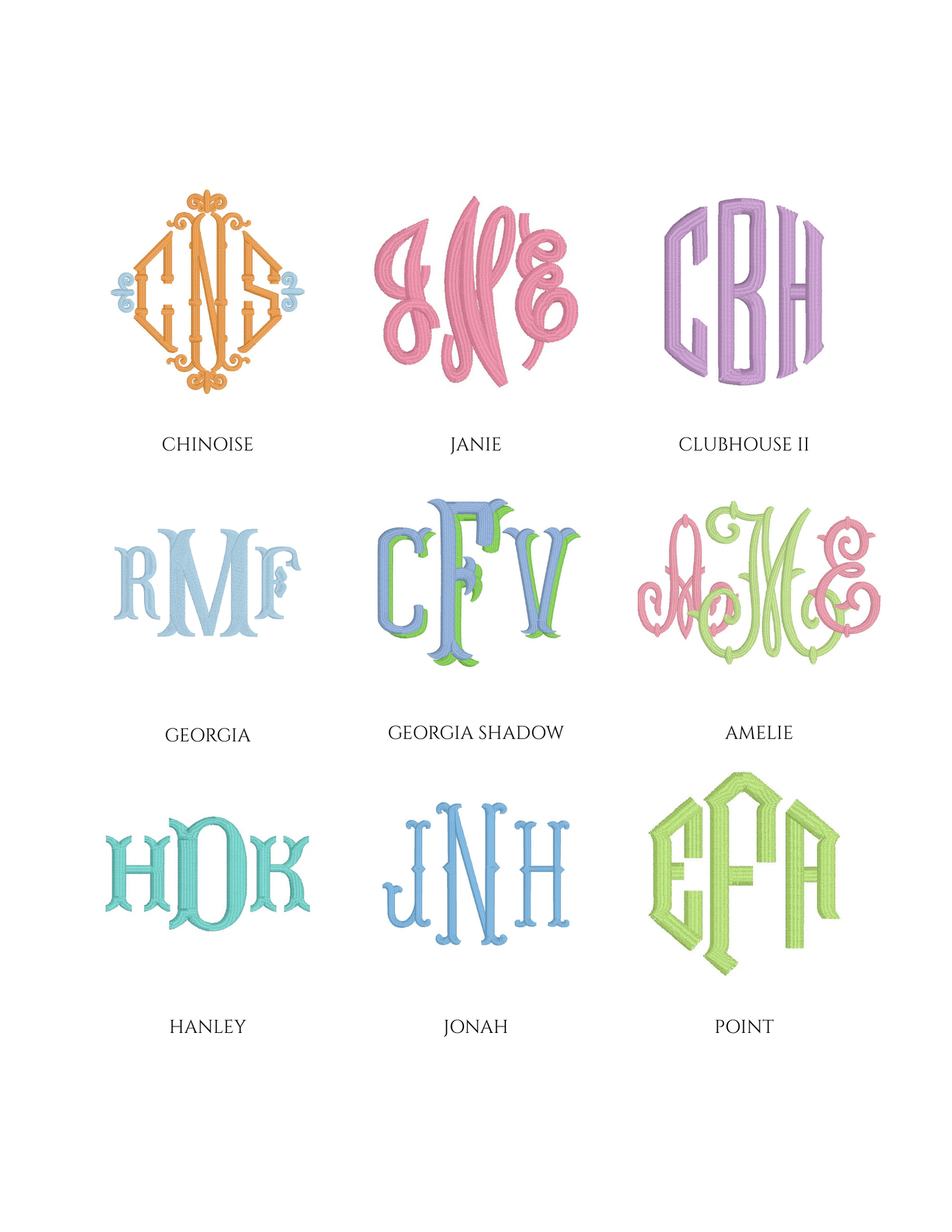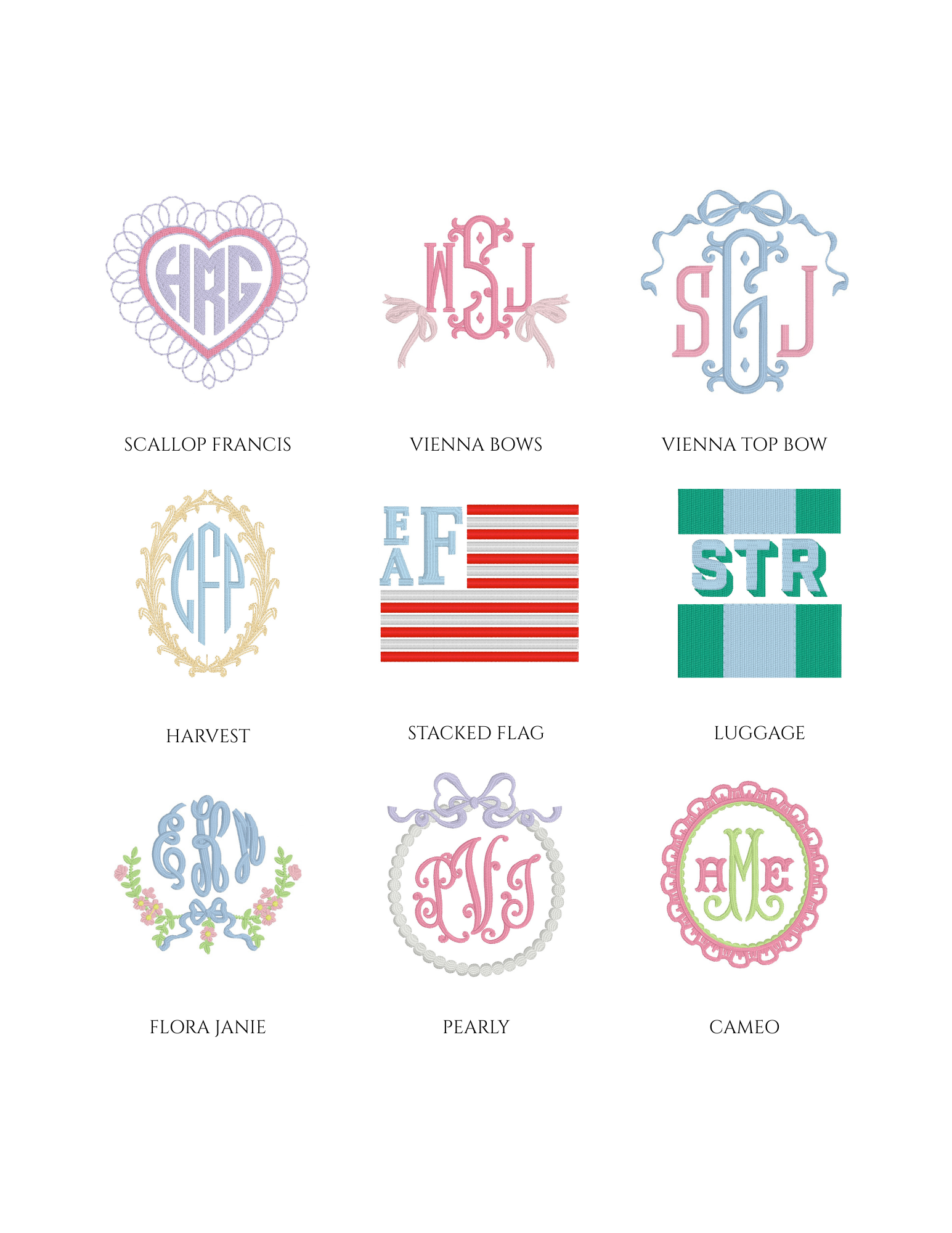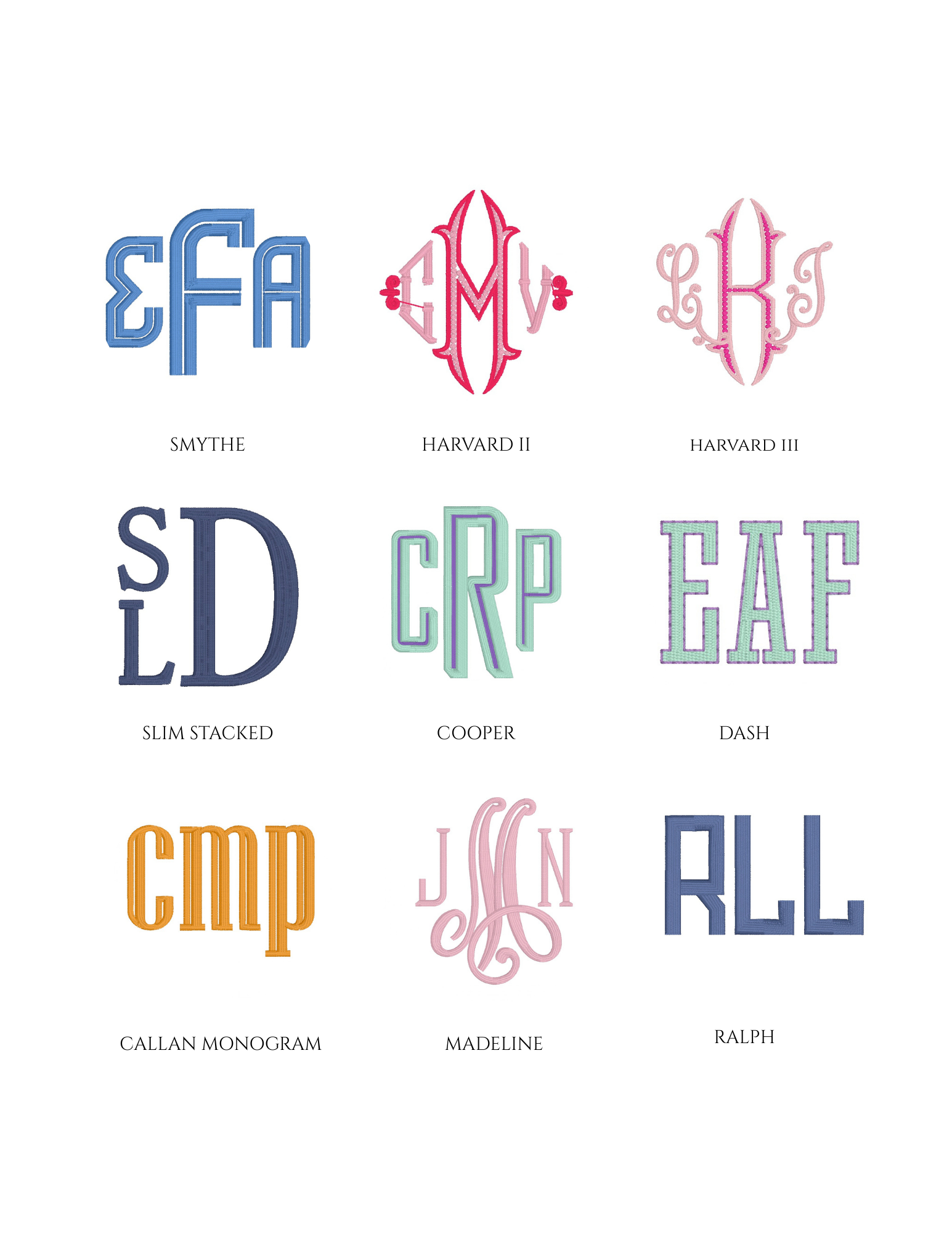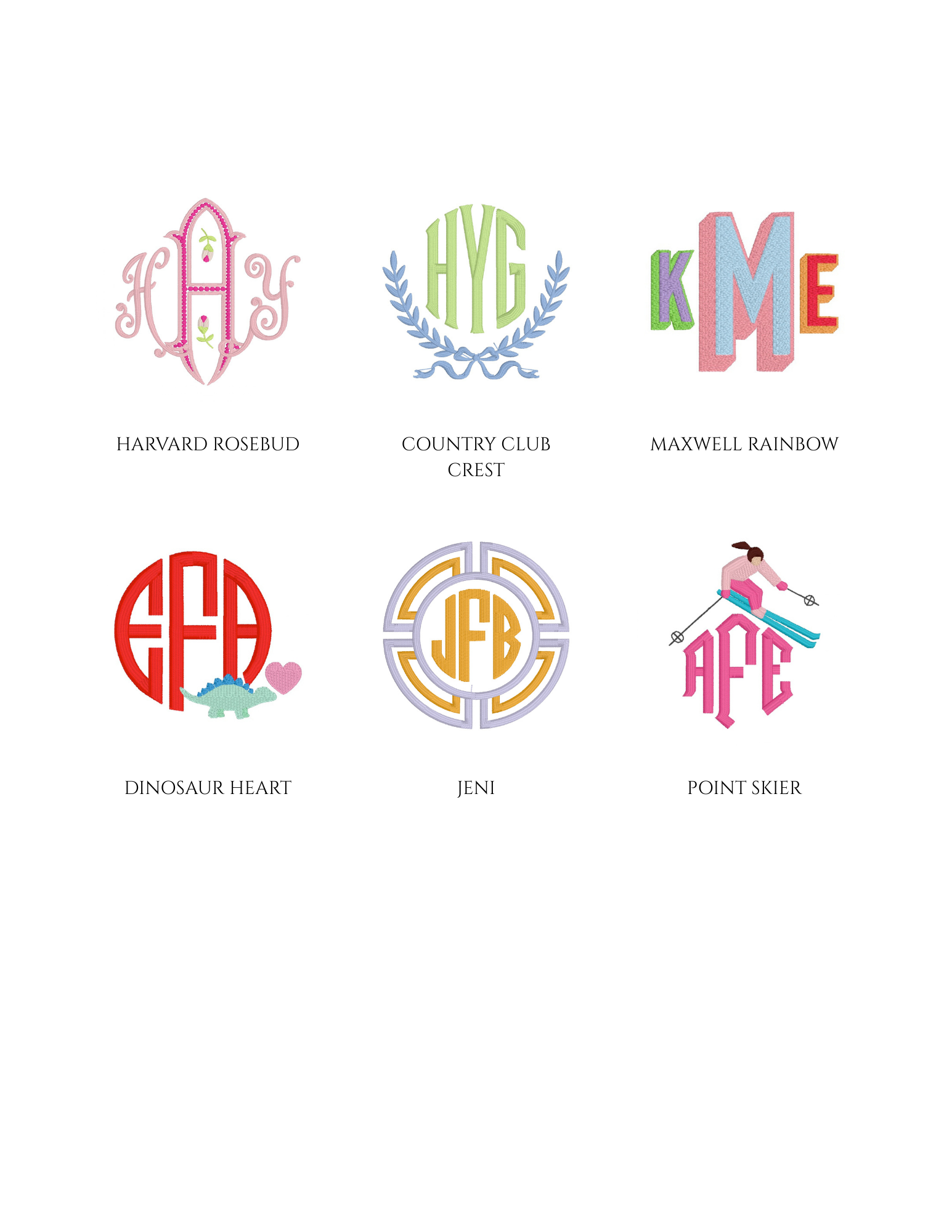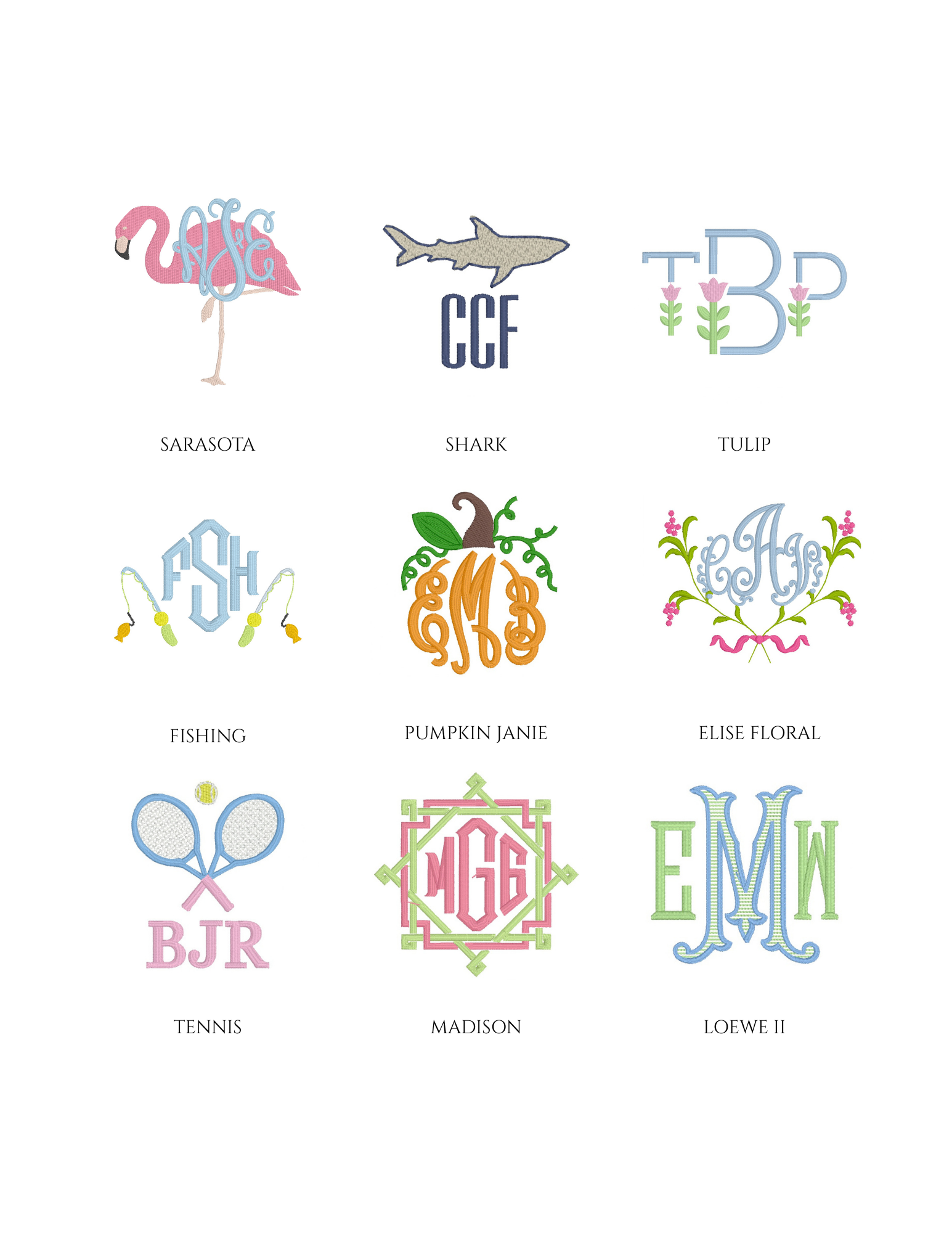 Embroidery is an art, and not every font or design style will fit or stitch well on every item. Below is a sample of some of the monograms in our collection.