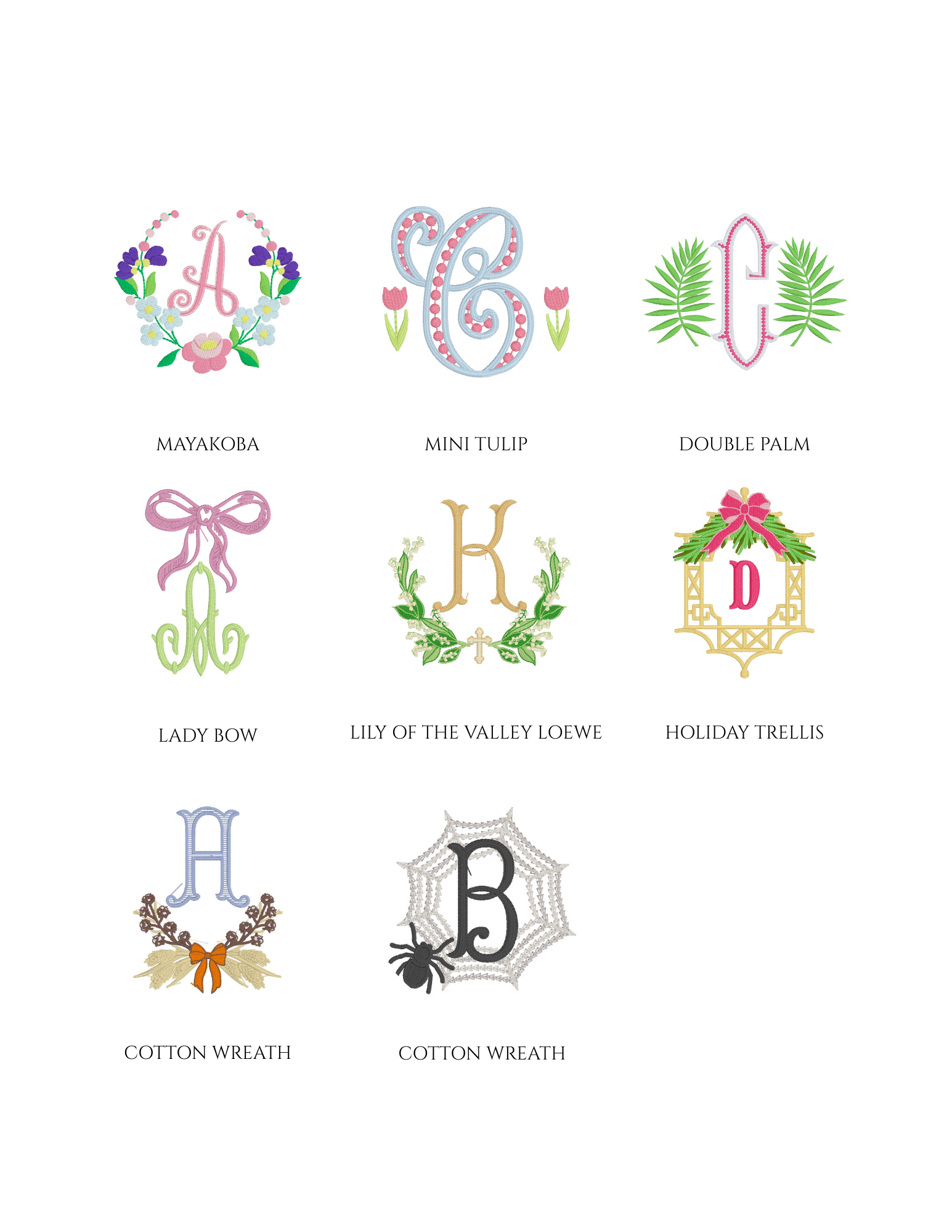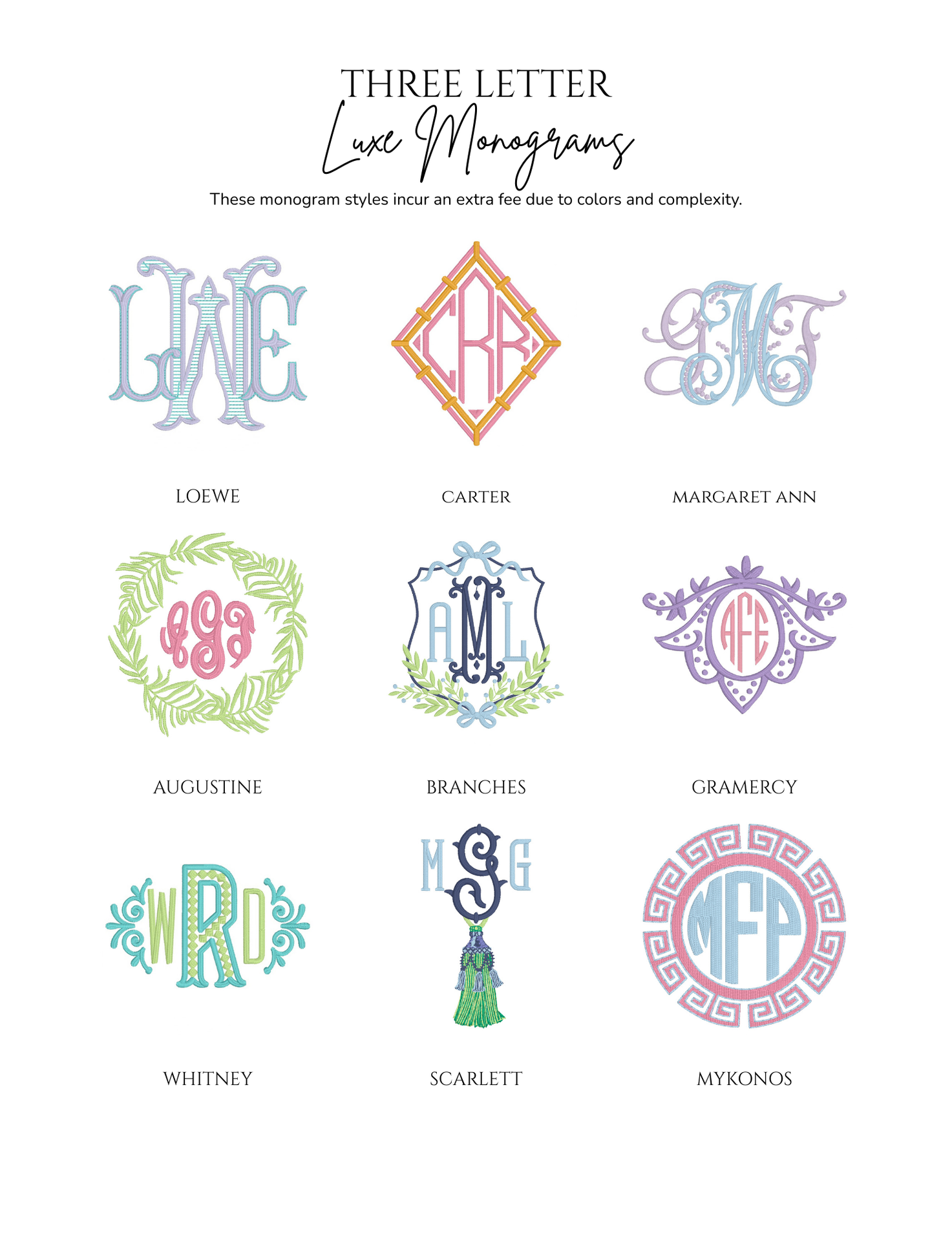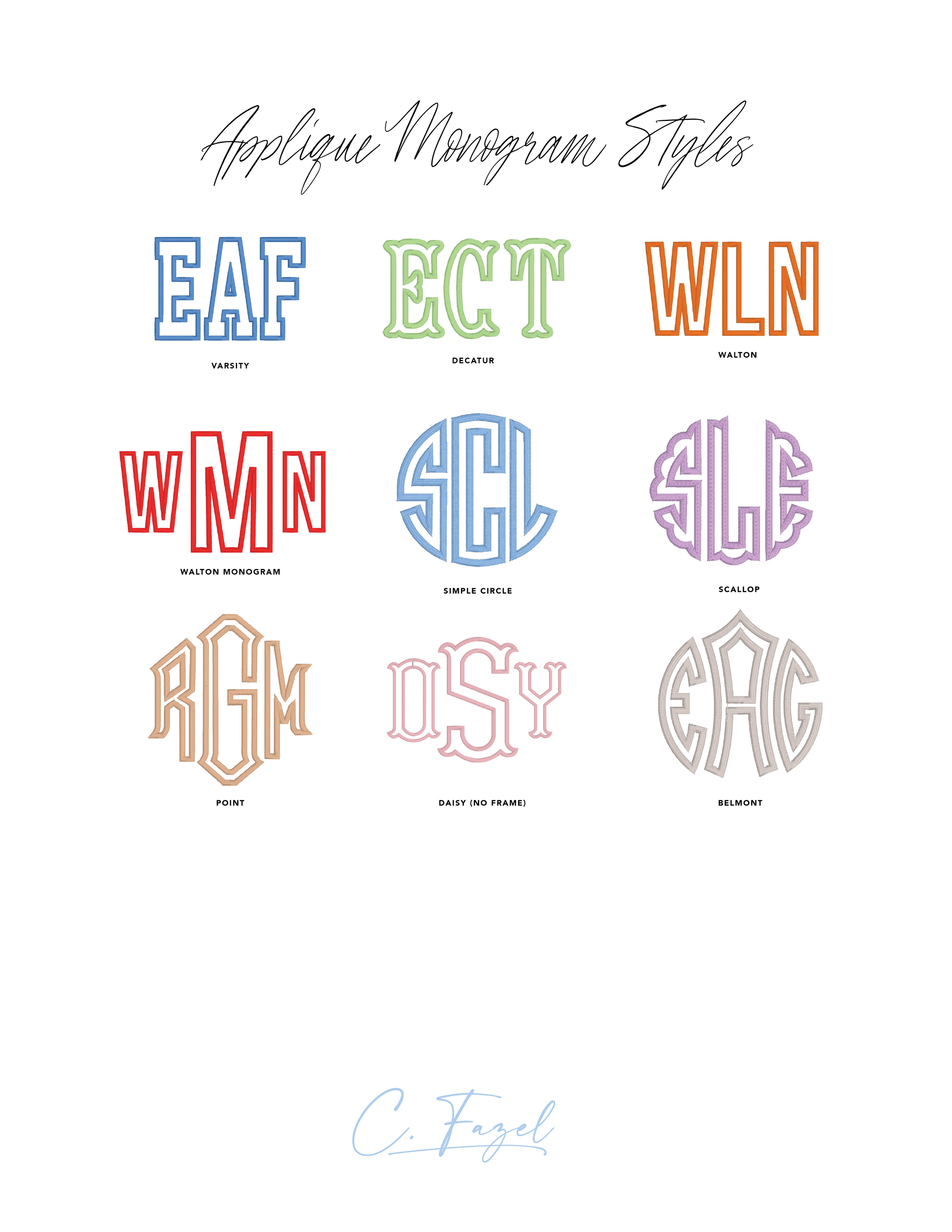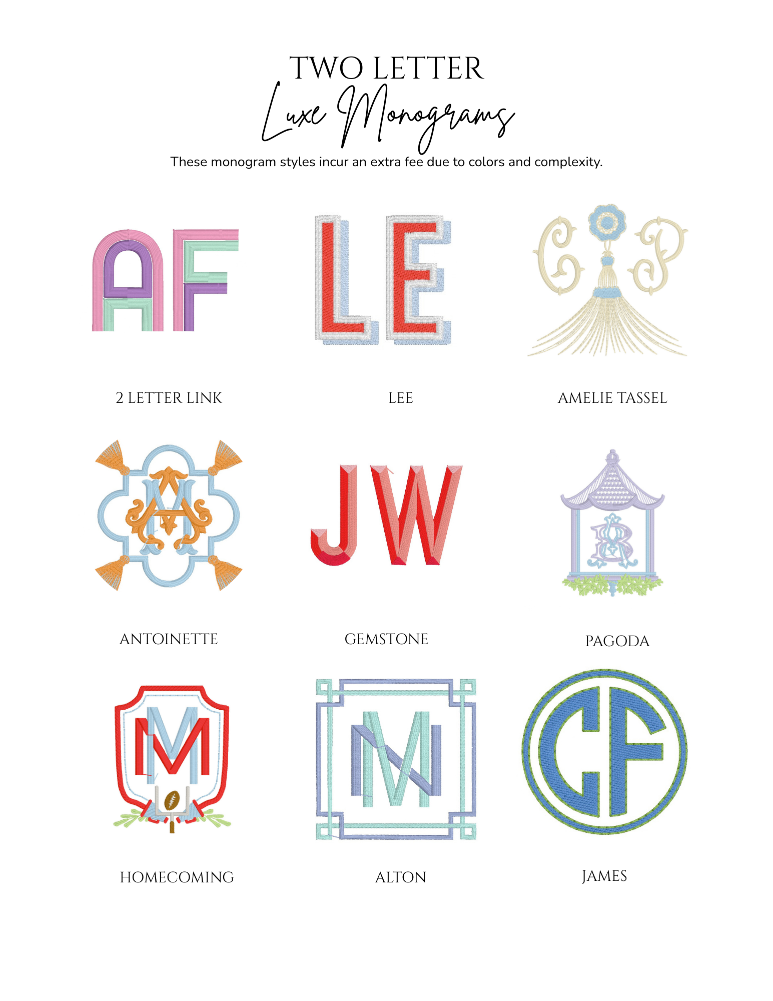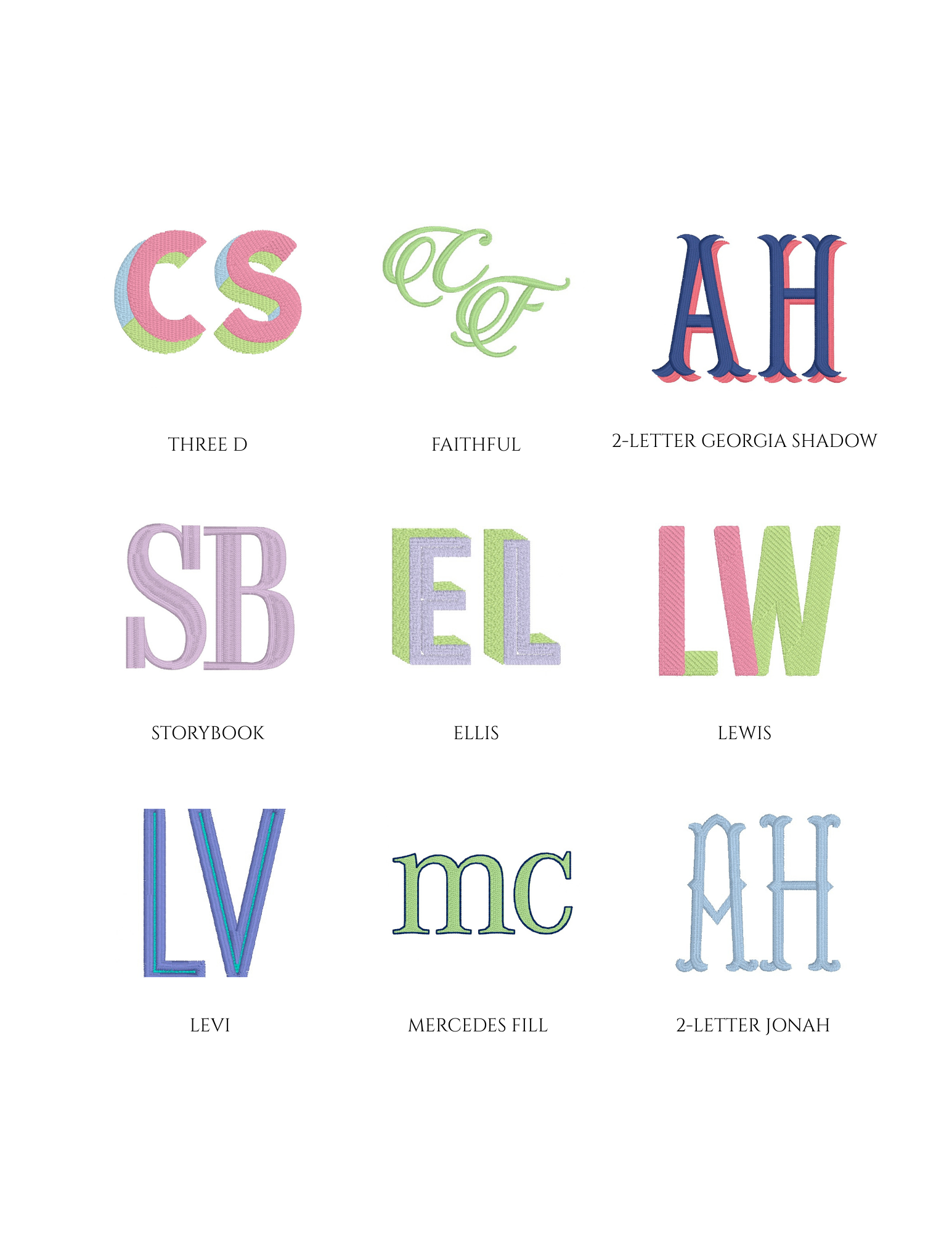 Embroidery is an art, and not every font or design style will fit or stitch well on every item. Below is a sample of some of the monograms in our collection.